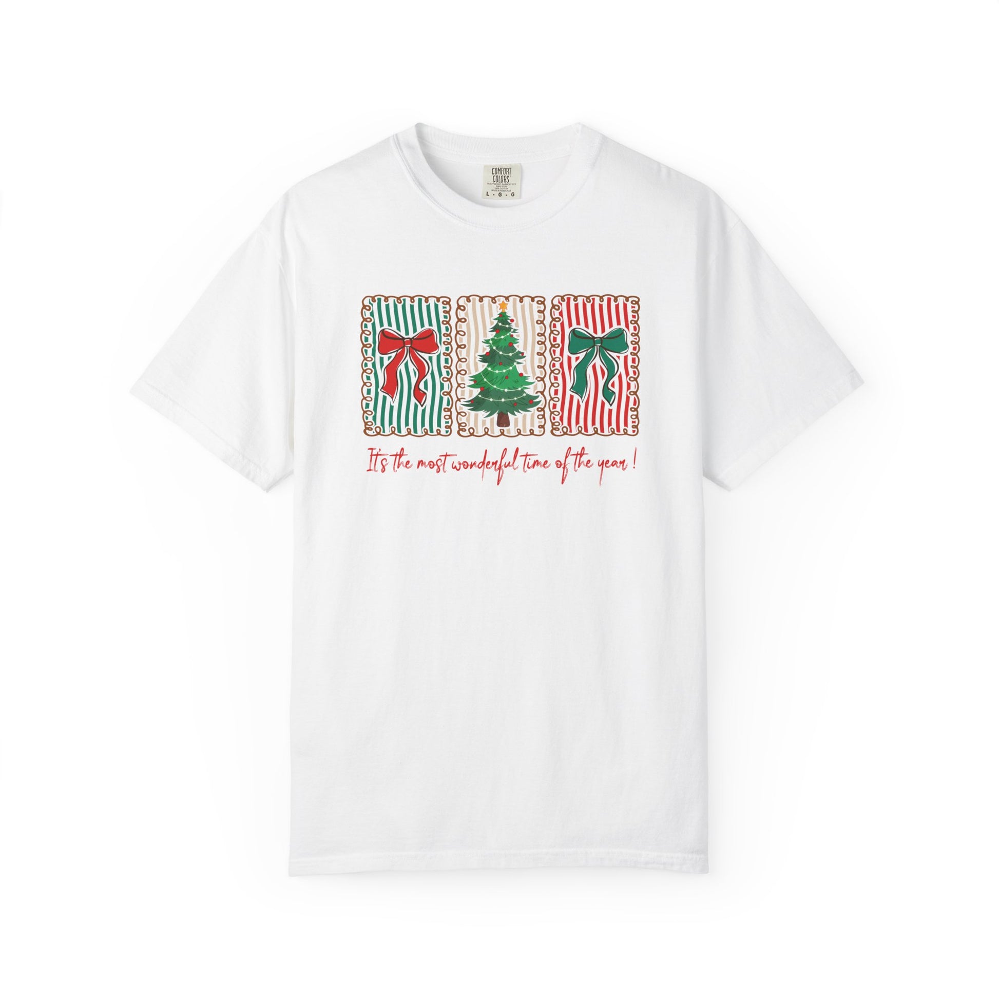 A soft, garment-dyed cotton tee with a hand-drawn holiday motif — three framed panels with bows and a small fir tree, touched with candy-cane stripes and handwritten script. The relaxed fit and medium-weight fabric drape like a favorite shirt you reach for again and again. Wear it to slow down at a tree-lighting, wrap presents by lamplight, or keep cozy with cocoa around friends. The vintage-dyed finish and sewn-in label give it a lived-in, comfortable feel that blends seasonal cheer with everyday wearability.