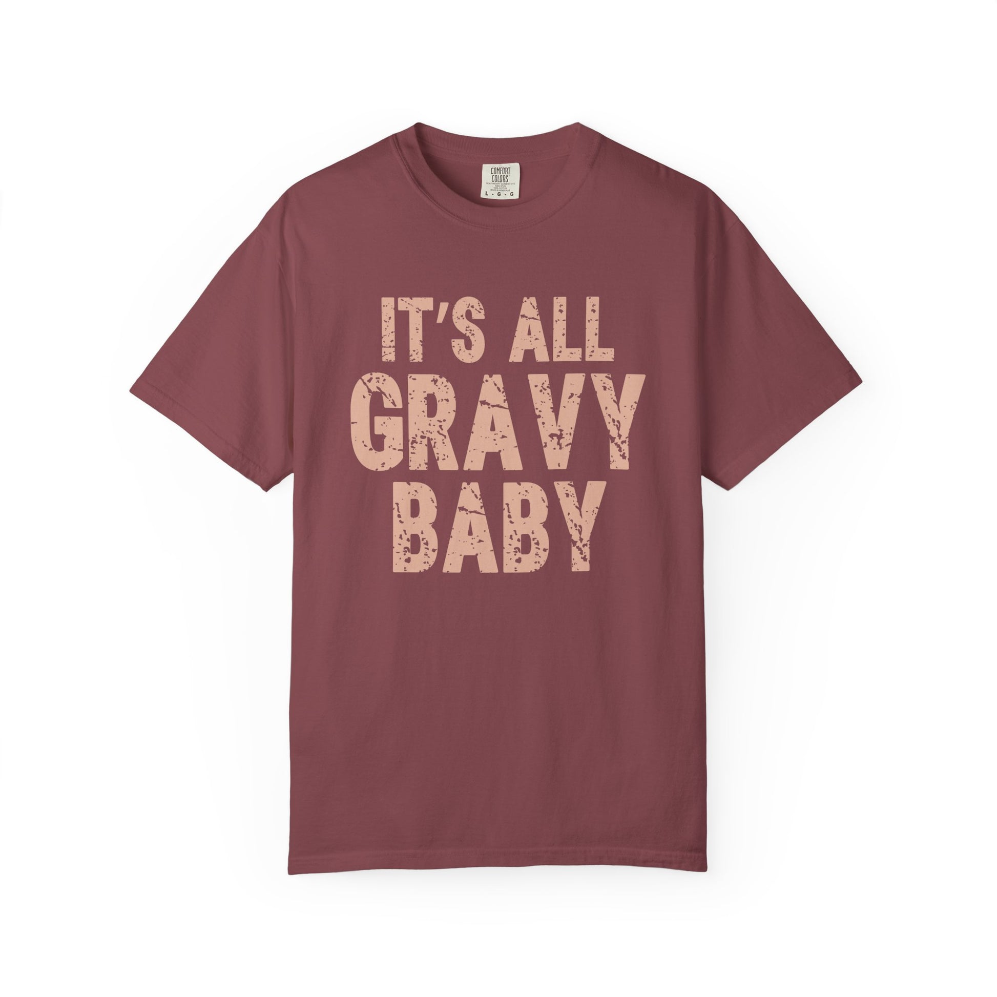 This 'It's All Gravy Baby' Comfort Colors T-shirt gives off a cozy and relaxed vibe, perfect for casual wear or lounging around. It's ideal for those who love humor and puns, and would make a great addition to a Thanksgiving or Friendsgiving celebration outfit.