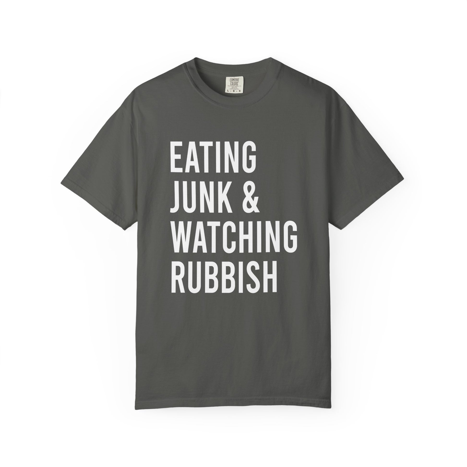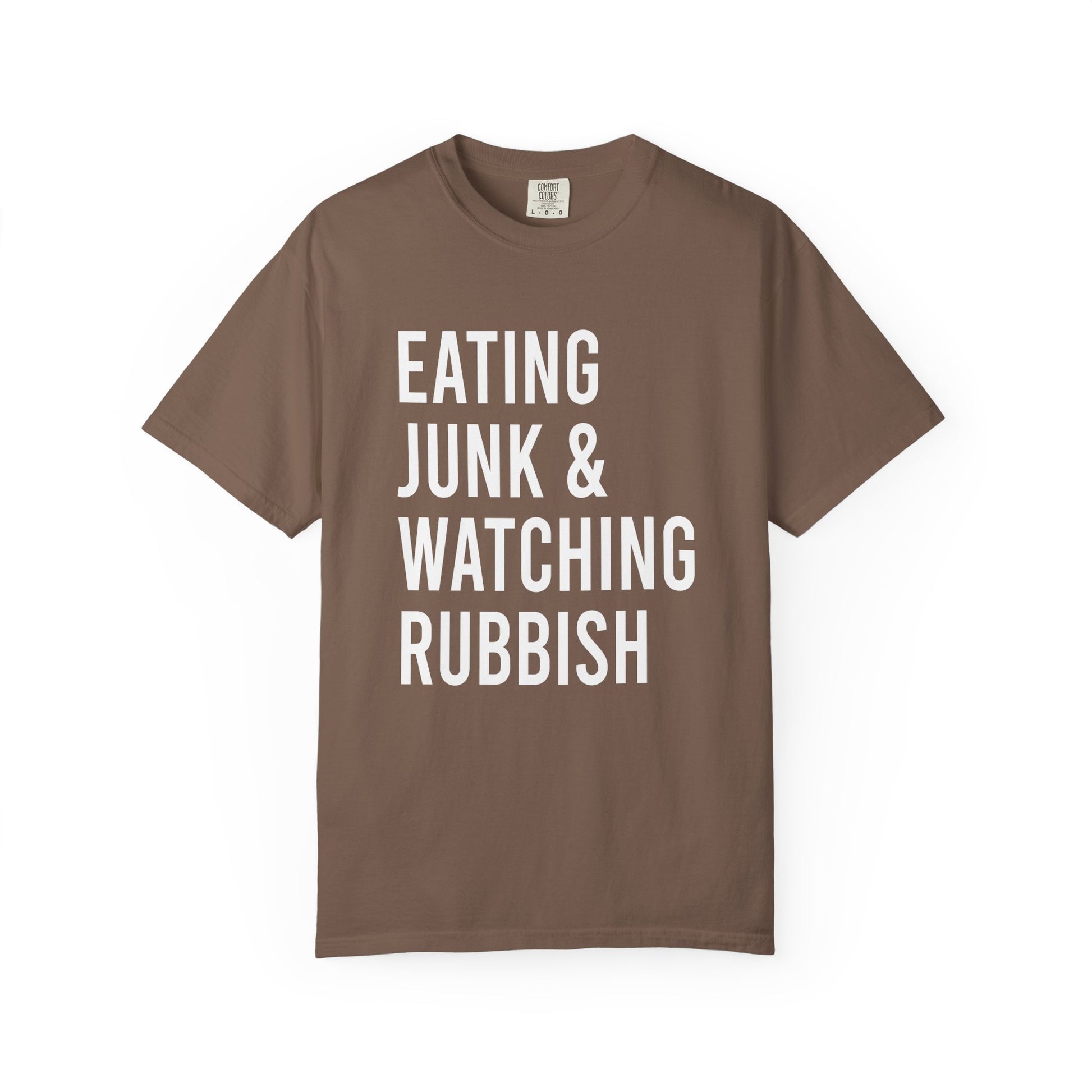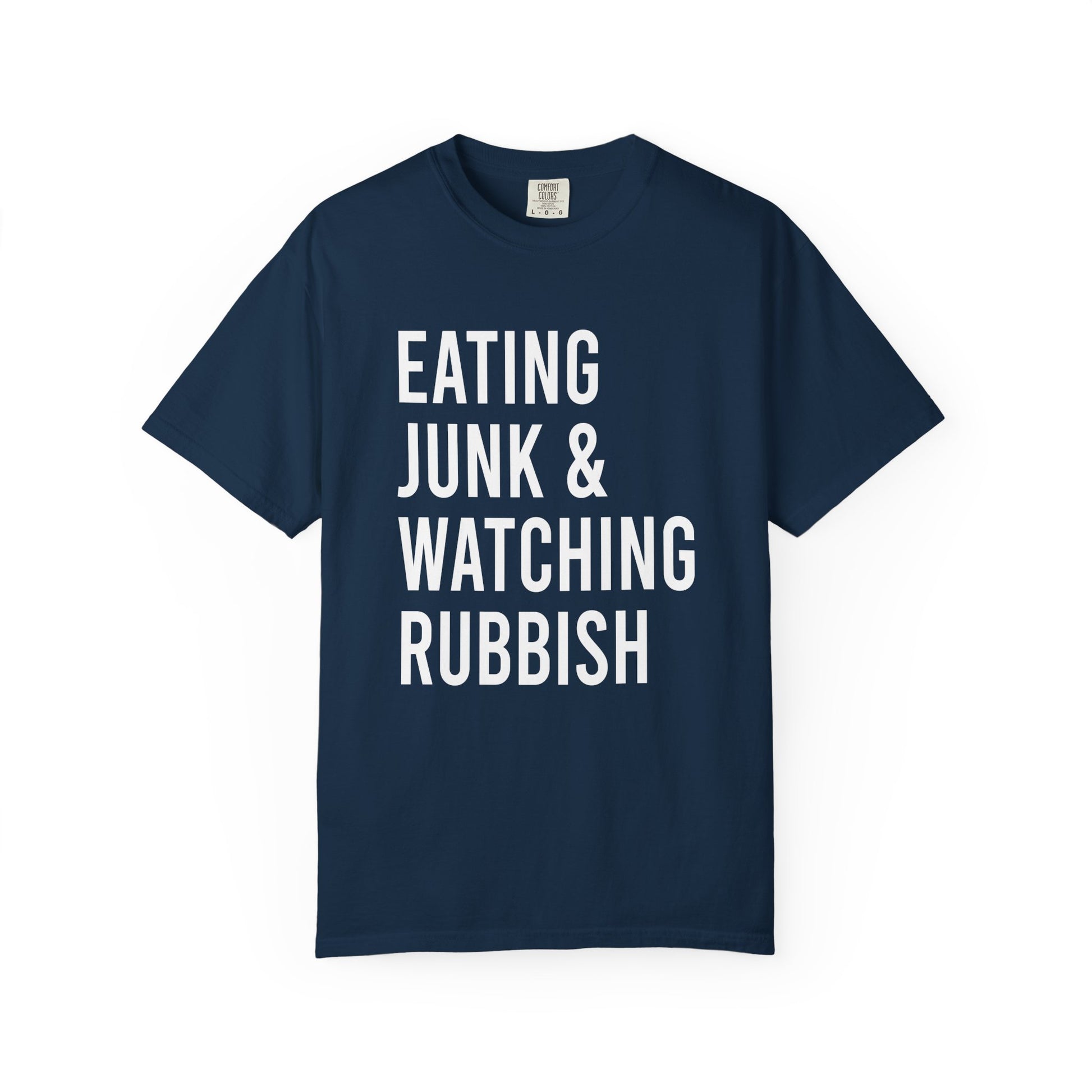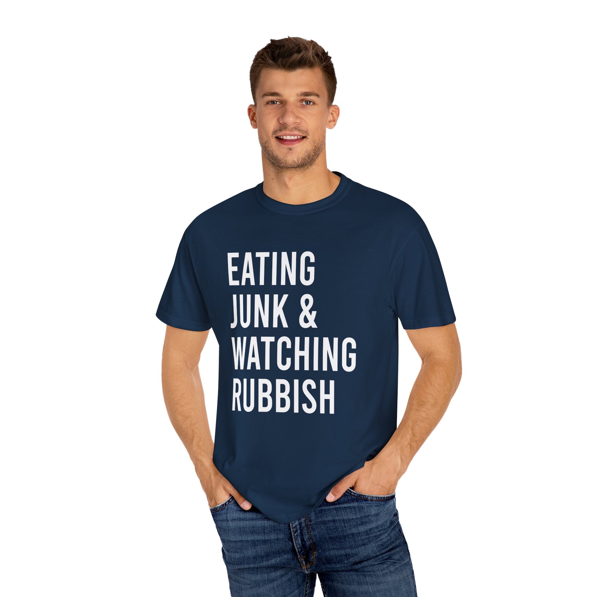 This Eating Junk & Watching Rubbish Comfort Colors T-shirt is perfect for those cozy nights in watching movies. The relaxed fit and 100% cotton fabric provide long-lasting comfort. Ideal for movie enthusiasts and those who enjoy lounging at home. Relevant for movie nights, stay-at-home days, and casual hangouts.