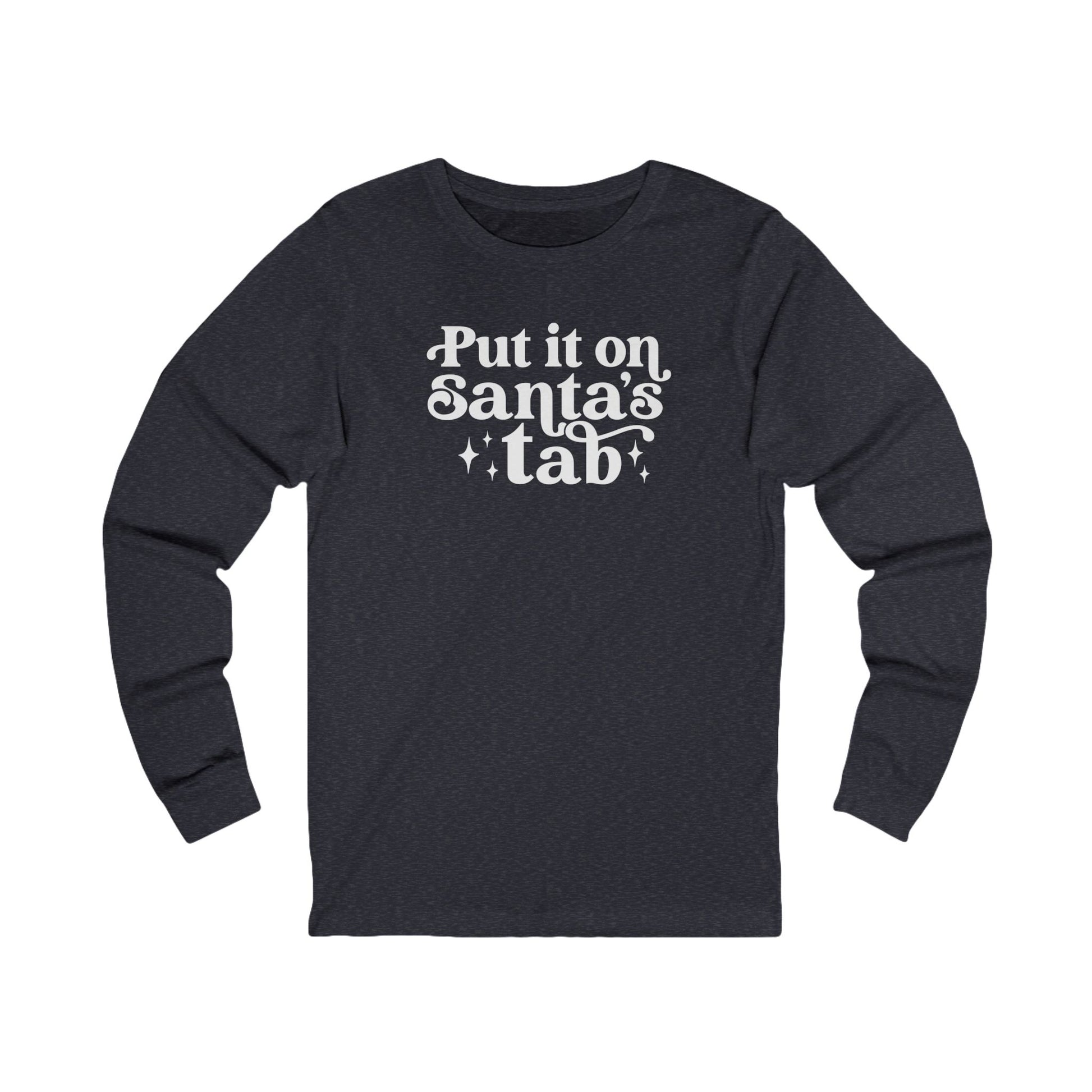 Stay cozy and festive with this 'Put It On Santa's Tab' long-sleeve tee. Perfect for the holiday season, this unisex tee fits well and keeps its shape thanks to the side seams and ribbed knit collar. Made from high-quality cotton blend, it's a must-have for adults looking for a comfortable and stylish holiday attire.