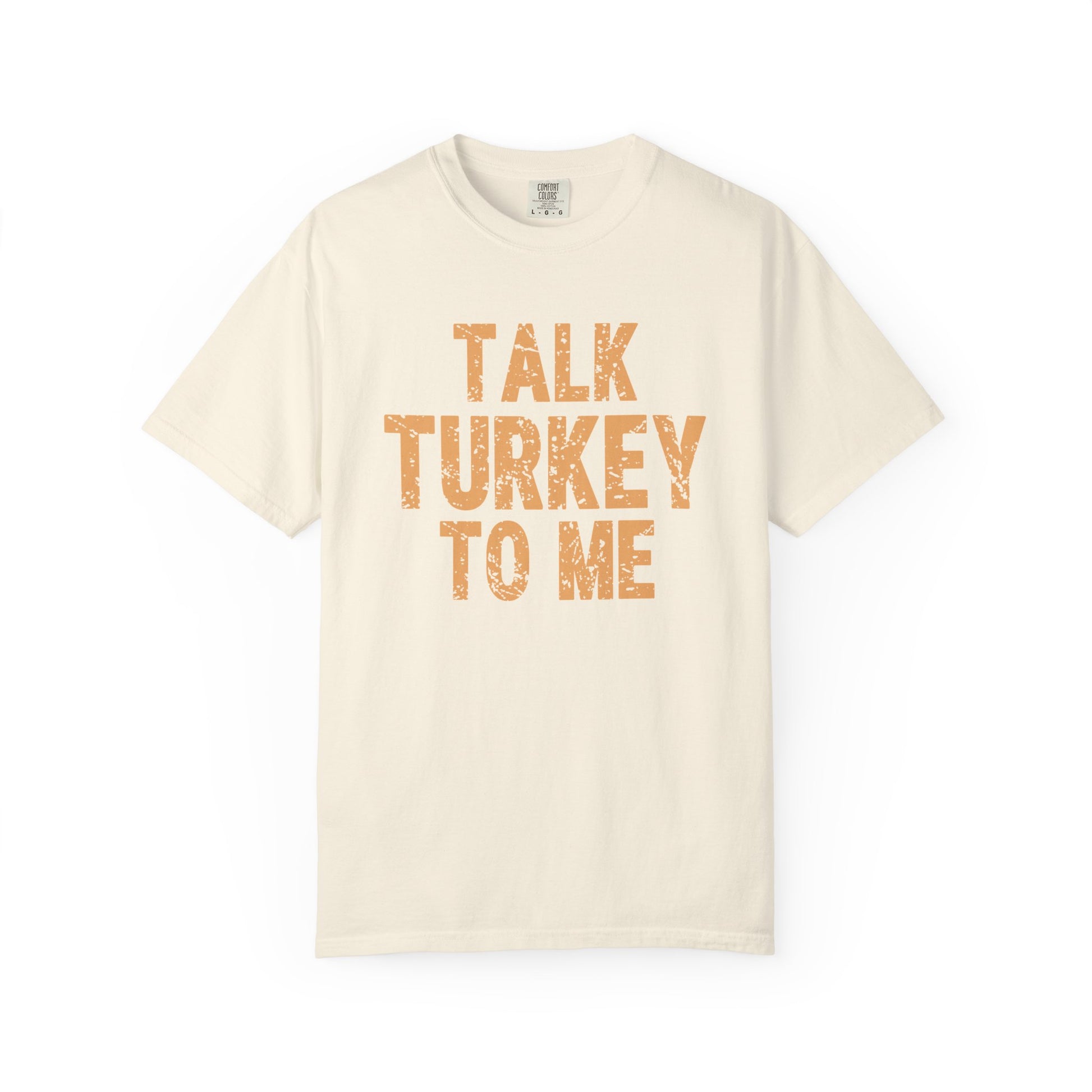 This Talk Turkey to Me Comfort Colors T-shirt exudes a fun and casual vibe, perfect for a relaxed and humorous look. Ideal for those who love celebrating Thanksgiving or have a love for puns. This unisex garment-dyed t-shirt is a must-have for anyone looking to add a touch of humor to their wardrobe.