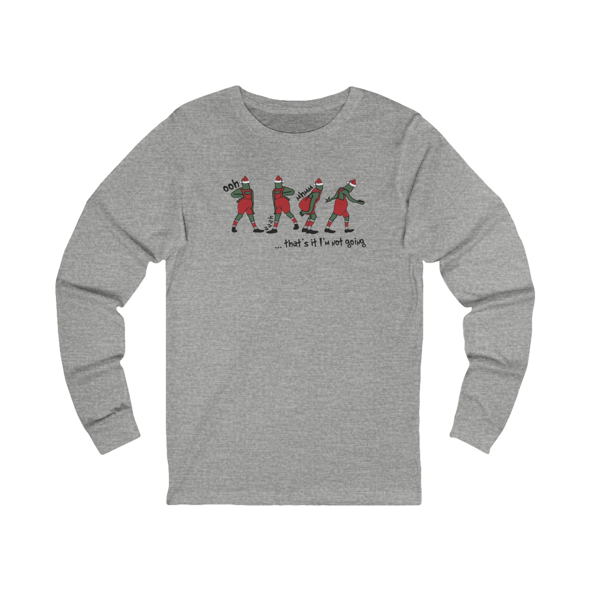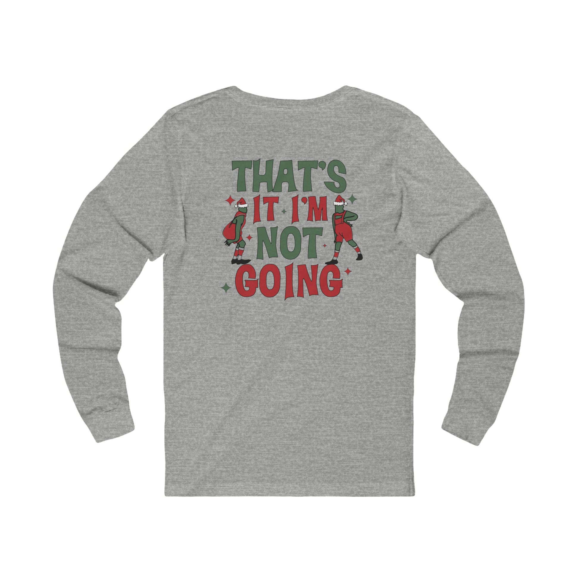 This "That's It I'm Not Going" Grinch Long sleeve Tee is perfect for anyone looking to show off their festive spirit during the holidays. Made with high-quality materials, this tee offers a comfortable fit and a stylish design. It is ideal for adults who enjoy celebrating Christmas and want to express their inner Grinch.