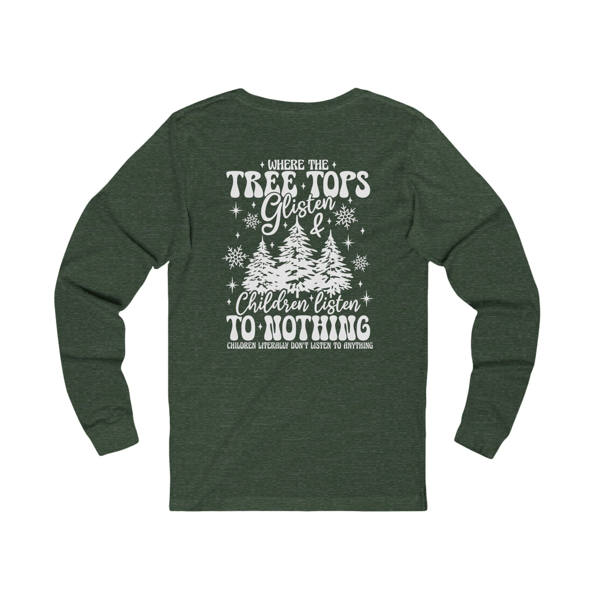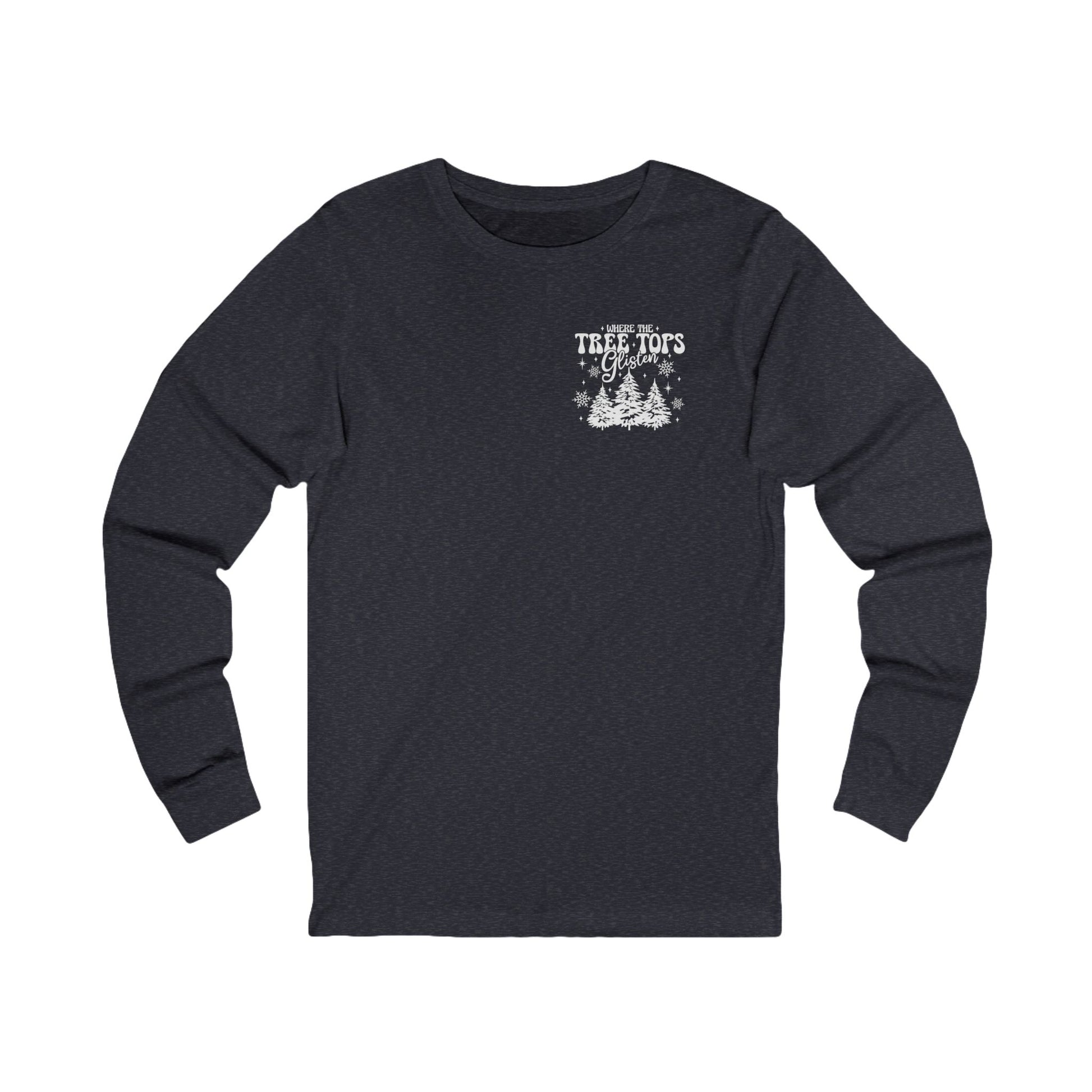 The Where Treetops Glisten Long-sleeve Tee offers a cozy and festive vibe, perfect for the holiday season. It is ideal for adults looking for a comfortable and stylish addition to their wardrobe during winter festivities.